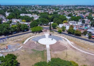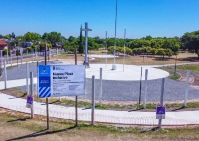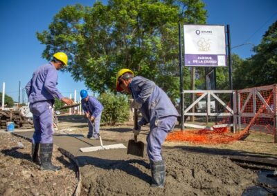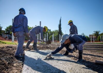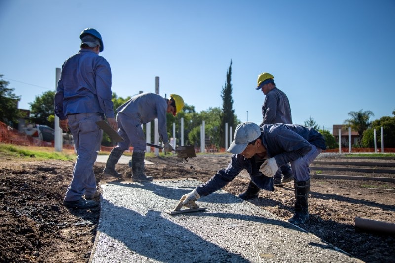 La obra, que ya lleva dos meses de ejecución, tiene completas las tareas de hormigonado tanto en las nuevas plazas de juego como en los senderos y el playón central de acceso. A su vez, se colocaron luminarias peatonales; se finalizó en su totalidad el anfiteatro escalonado, que servirá de lugar de esparcimiento y descanso; y actualmente se encuentra en ejecución el tótem institucional en la esquina de acceso.