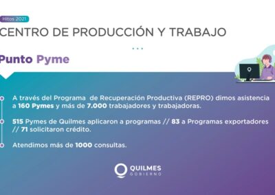 Desde Punto Pyme, iniciativa local que busca ser un centro de soluciones para el sector y acercarlo a los créditos y subsidios nacionales y provinciales, en 2021 se visitaron 40 industrias y se atendieron 945 consultas, superando ampliamente las 50 de 2020. Además, 515 pymes aplicaron a distintos programas de apoyo del Estado y 83 a programas exportadores. Hubo 71 solicitudes de crédito, que el Municipio derivó a las entidades correspondientes. Asimismo, a través de REPRO, se dio asistencia a 160 pymes y 7.539 trabajadores.