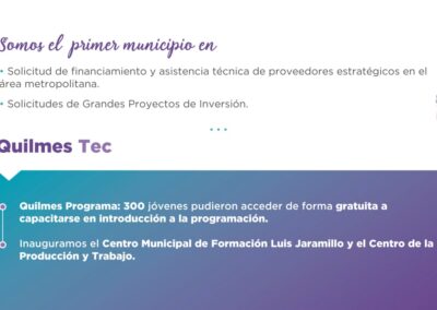 Otro de los logros de la gestión fue el lanzamiento, en el marco de Quilmes TEC, de Quilmes Programa, con 300 inscriptos en 48 horas. De ese total, 110 fueron aprobados para pasar al Argentina Programa, una capacitación en programación gratuita y virtual en donde se enseñan los fundamentos básicos y se profundiza en los conocimientos para convertirse en un programador web full stack junior.