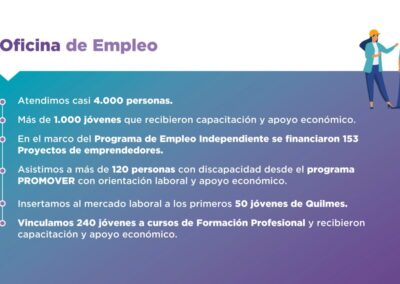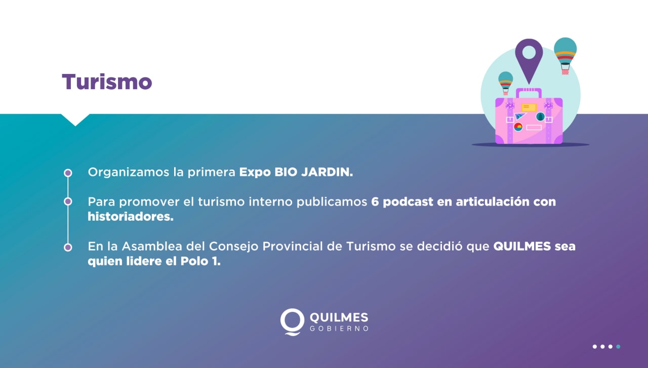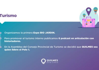 Finalmente, desde el área de Turismo, se organizó la primera Expo Bio Jardín; se publicaron 6 podcast en articulación con historiadores locales para promover el turismo interno; se articuló con el Fondo para Establecimientos Turísticos y Culturales de la Provincia de Buenos Aires; y en la Asamblea del Consejo Provincial de Turismo se decidió que Quilmes lidere el Polo de Desarrollo Turístico Regional N° 1.