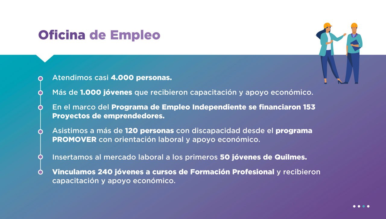 En tanto, desde la Oficina de Empleo, a lo largo del 2021, se atendieron 3.922 personas, 1.148 jóvenes accedieron a capacitación y apoyo económico, y 50 se insertaron en el mercado laboral. Además, se brindó asistencia a 121 personas con discapacidad en el marco del programa Promover la Igualdad de Oportunidades de Empleo. Y, a través del Programa de Empleo Independiente, se financiaron 153 proyectos de emprendedores, lo equivalente a los últimos 10 años aproximadamente.