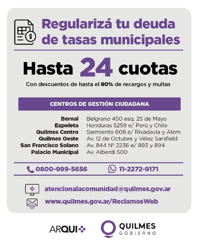 El Municipio de Quilmes informa a los contribuyentes que adeuden tasas municipales que hasta el 28 de febrero...
