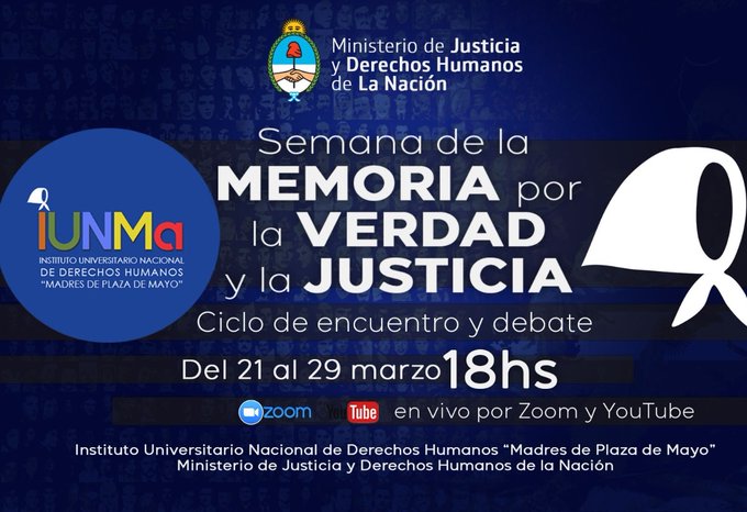 Organizada por el Instituto Universitario Nacional de Derechos Humanos «Madres de Plaza de Mayo» (IUNMa) se desarrollará desde el 21 al 29 de marzo con exposiciones diarias, a las 18, que se transmitirán por las plataformas Youtube y Zoom, una serie de ponencias semanales a 46 años del Golpe de Estado. Además, se abordará el tema de la Guerra de Malvinas y de la soberanía argentina sobre el archipiélago austral, ya que el 2 de abril se cumplirán 40 años del comienzo del conflicto bélico con Gran Bretaña. Hoy lunes 21, Bielsa y Valdés expondrán sobre «Conflicto bélico y derechos humanos en el contexto de un cambio de época»; el martes 22 Dora Barrancos y las escritoras Gloria Peirano y Lucila Grossman disertarán sobre «Género y memoria: una mirada desde la historia y la literatura», mientras el miércoles 23 la Defensora del Público Miriam Lewin y el profesor Javier Romero abordarán el tema «Por la memoria, la verdad y la justicia. La manipulación mediática».