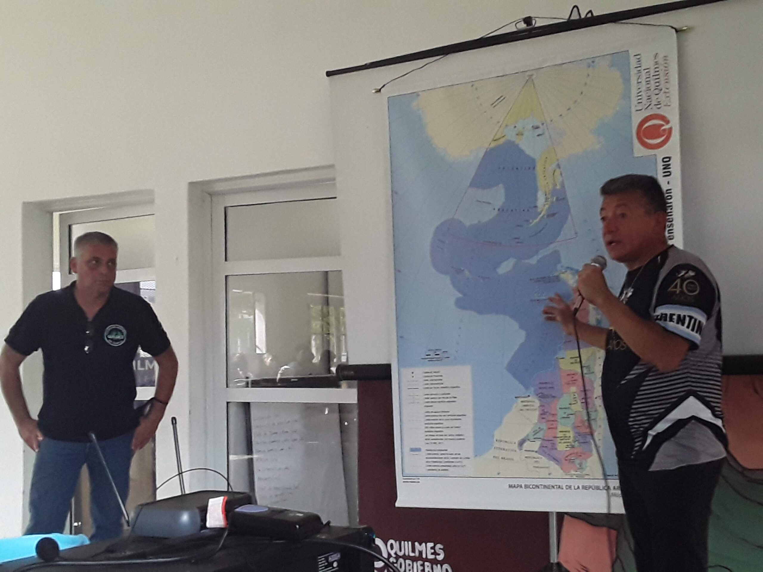 Asimismo, los integrantes del Centro de Veteranos de Guerra de Quilmes entregaron una lámina y un mapa mural de la Argentina Bicontinental a escala con orientación Sur/Norte; es decir, donde se muestra la imagen de Nuestra República dispuesta con el Polo Sur en la parte superior del plano y desplegado integralmente hasta La Quiaca, a fin de que sean integrados en diversas prácticas educativas. Este aporte representa otra mirada sobre el territorio nacional e intenta aportar elementos para poner en valor nuestra pertenencia al espacio austral, reforzando una perspectiva argentina antártica y marítima, donde Malvinas resulta el pivote de la disputa por los extensos territorios del Atlántico Sur que hoy se encuentran sistemáticamente saqueados por Londres. Cabe subrayar que el Centro de Veteranos de la Guerra de Malvinas de Quilmes en conjunto con la Universidad Nacional de Quilmes llevan adelante el proyecto “El ojo decolonial y el mundo que nos enseñaron” dirigido por la doctora Mariela Carassai y el Magister Ariel Hartlich, que tiene por objeto la revalorización integral de toda la jurisdicción nacional y tiene proyectado la generación de prácticas educativas asociadas a la soberanía nacional en diversas escuelas del distrito.